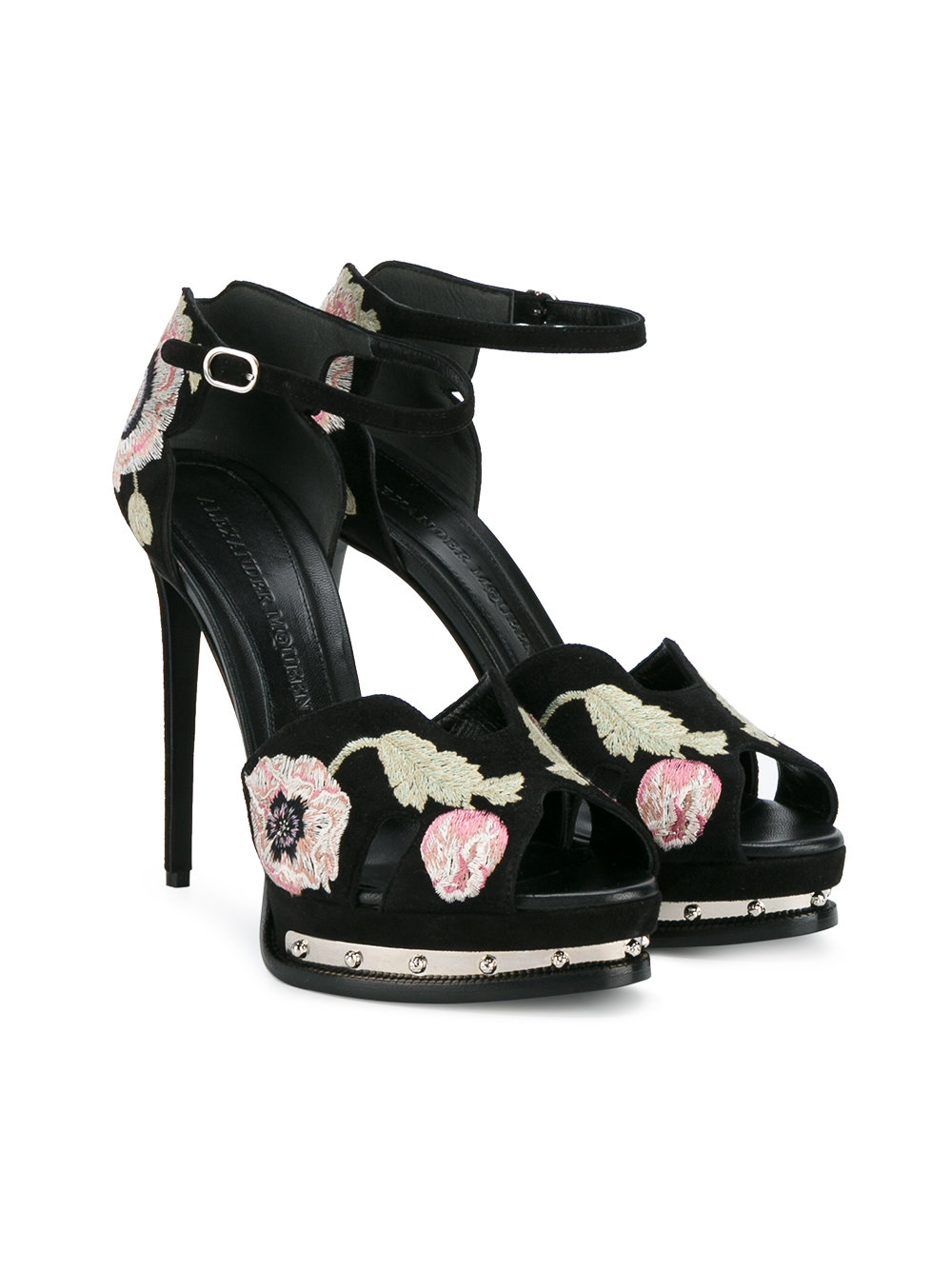 Her black suede sandals feature colorful floral embroidery, a peep-toe silhouette, silver stud embellishment, and sky-high 5.1″ heels.