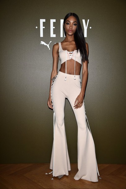 Jourdan Dunn attended the Fenty x Puma Runway show in the brand’s pink side-lace bell bottom pants and matching crop top.