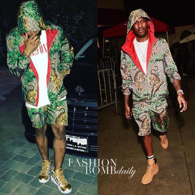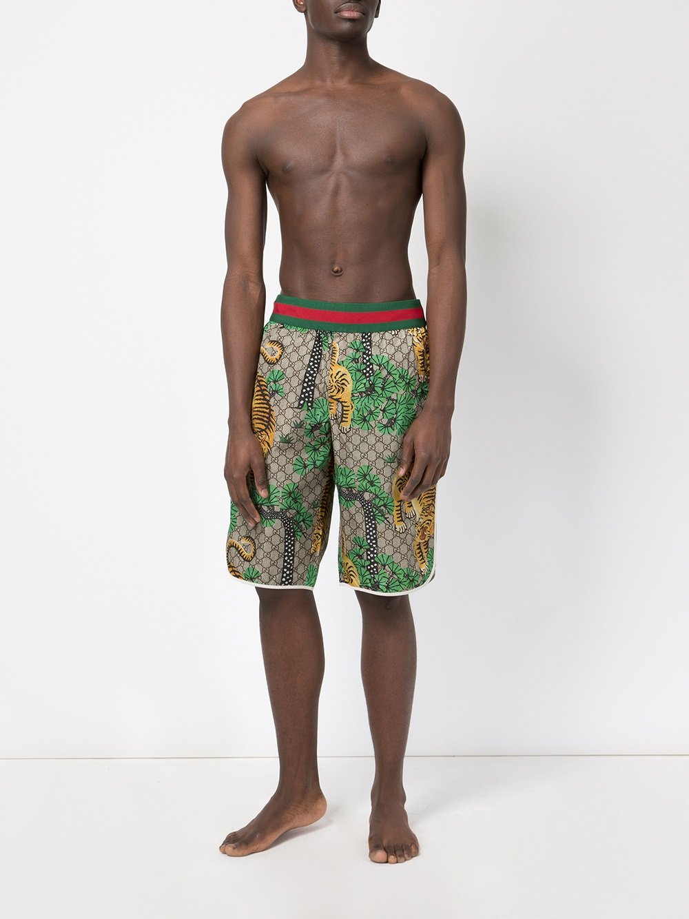 Both men are wearing swim shorts with their jacket, with Meek Mill in the knee-length version. The multicoloured Bengal print swim shorts by Gucci featuring a knee length, an elasticated waistband, a contrast piped trim, Gucci Supreme logo pattern, GG Vintage Web waistband and signature Gucci Bengal tigers.