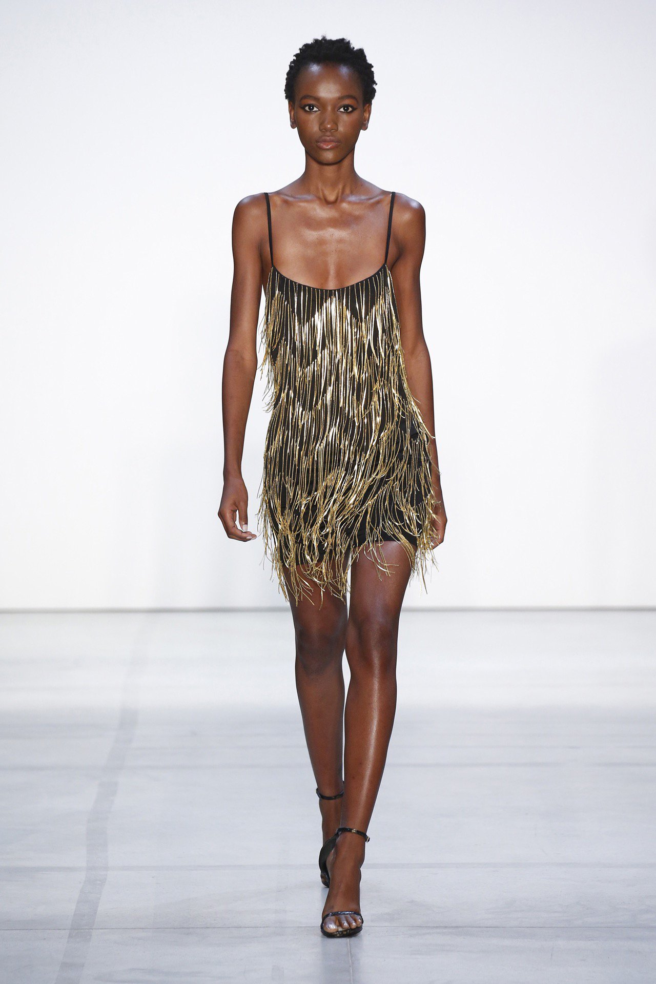 Her slip dress features hand-embellished gold chain detailing, adjustable straps, a mini hemline, and low back.