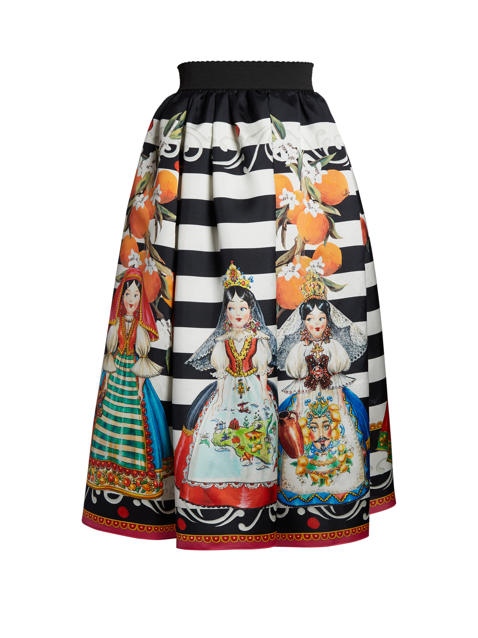 Her black and white mikado skirt features stripe detailing, a contrast waistband, full silhouette, and midi length.