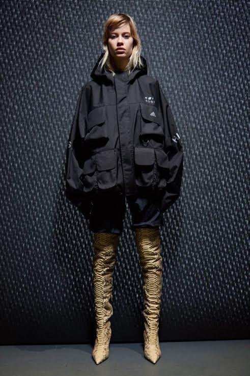 She paired her Off White coat with a cream colored off the shoulder dress and Yeezy Fall 2017 thigh-high python print boots.