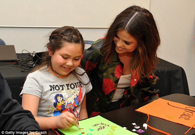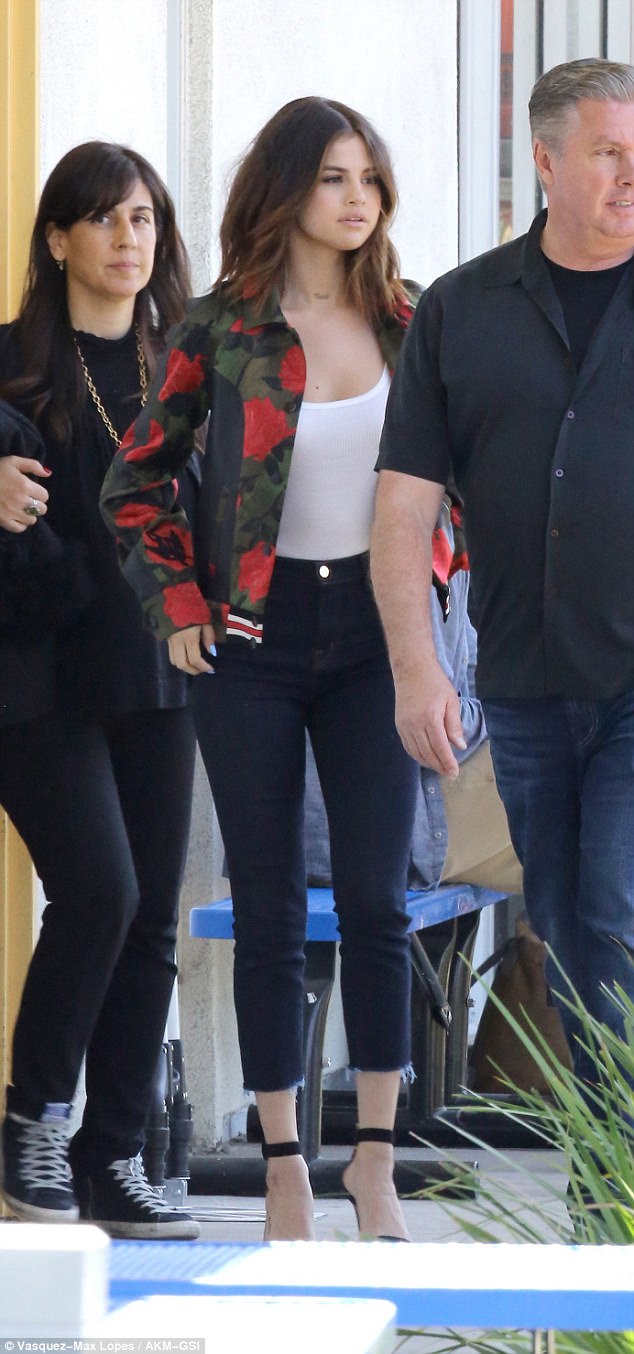 Selena Gomez filmed a PSA in LA clad in denim pants, a white tee shirt and a $995 Coach Camo Rose Varsity Jacket: