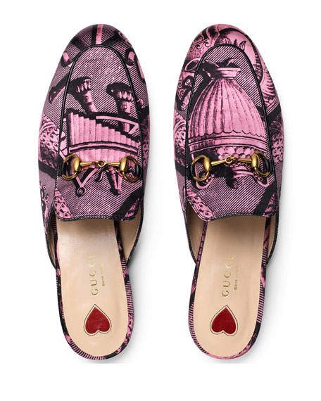 The flat stacked heel mules feature a round toe and Roman print in black and pink.