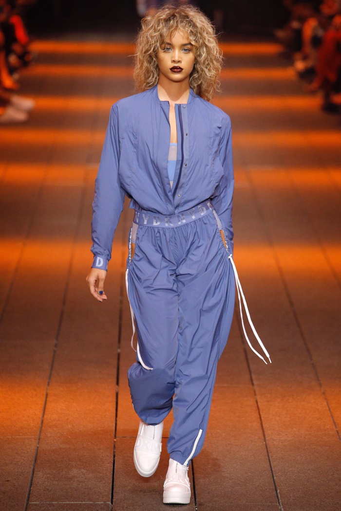 The blue DKNY track suit is made out of nylon material and trimmed in white. The high waist drawstring pants feature deep pockets and zipper closures at the ankles.