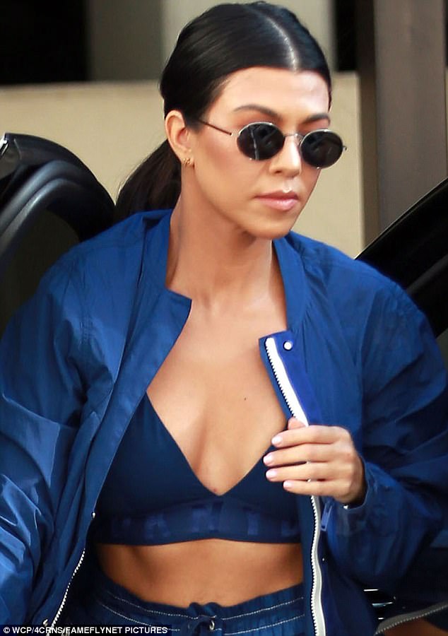 Kourtney completed her athleisure look with circular sunnies, a blue bralette and white sneakers.
