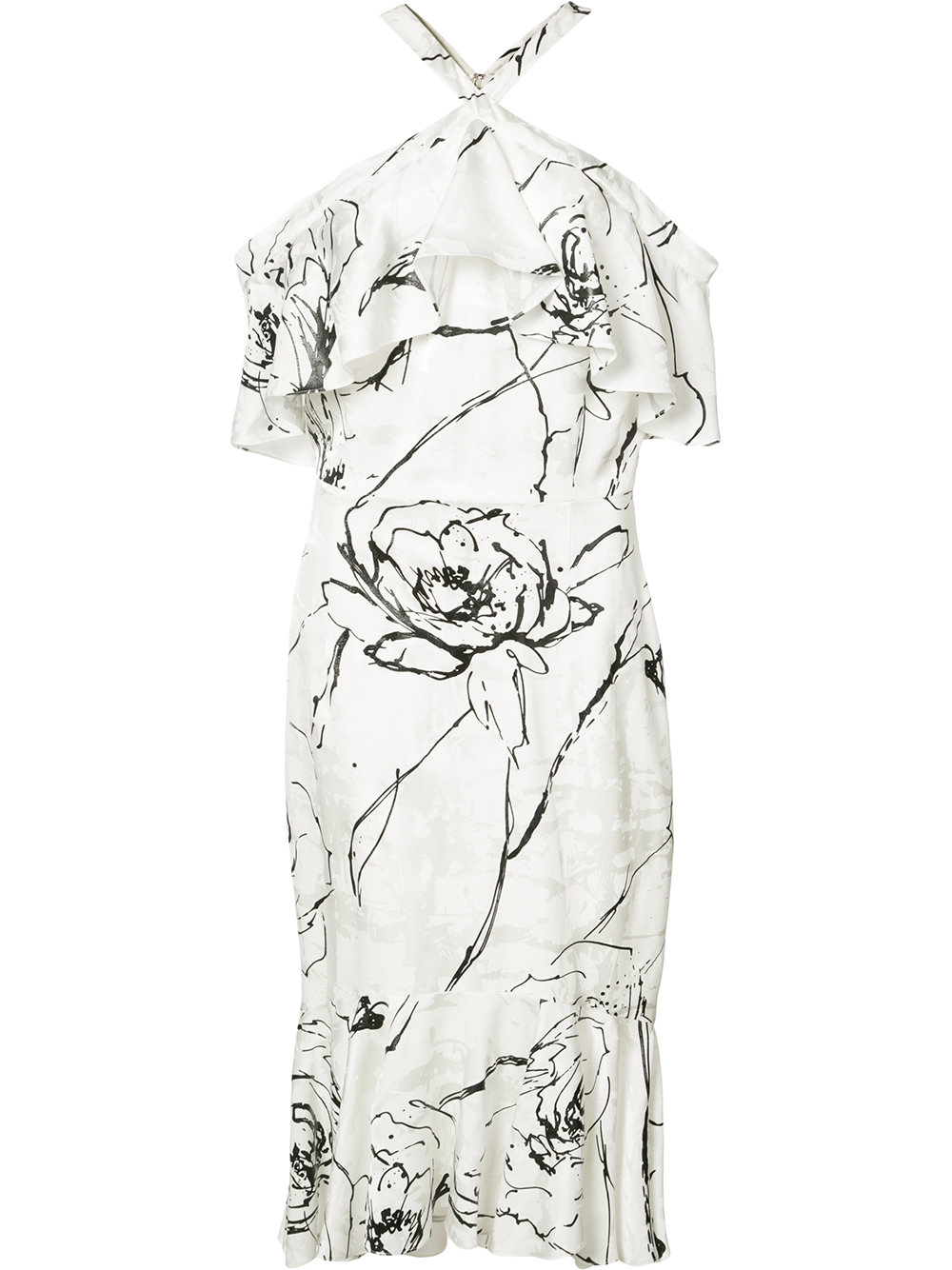 Her black and white floral print dress features a crisscross halter neckline, cold shoulder silhouette, ruffle detailing, a flounce hem, and knee length.