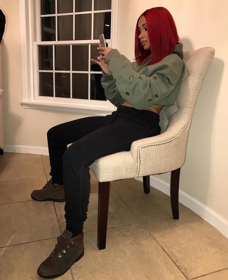Cardi looked relaxed in a pair of black sweats and beef and broccoli Timberland boots.