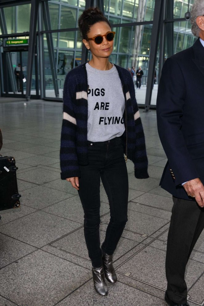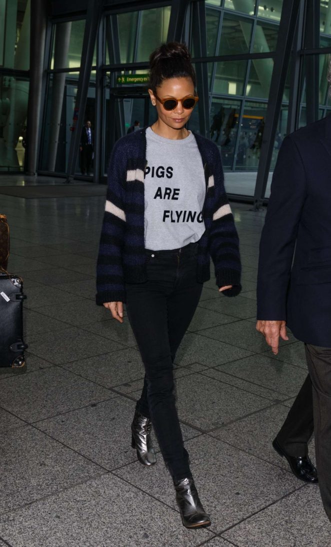 Thandie Newton traipsed through Heathrow in an $84 Ashish Pigs Are Flying T-Shirt: