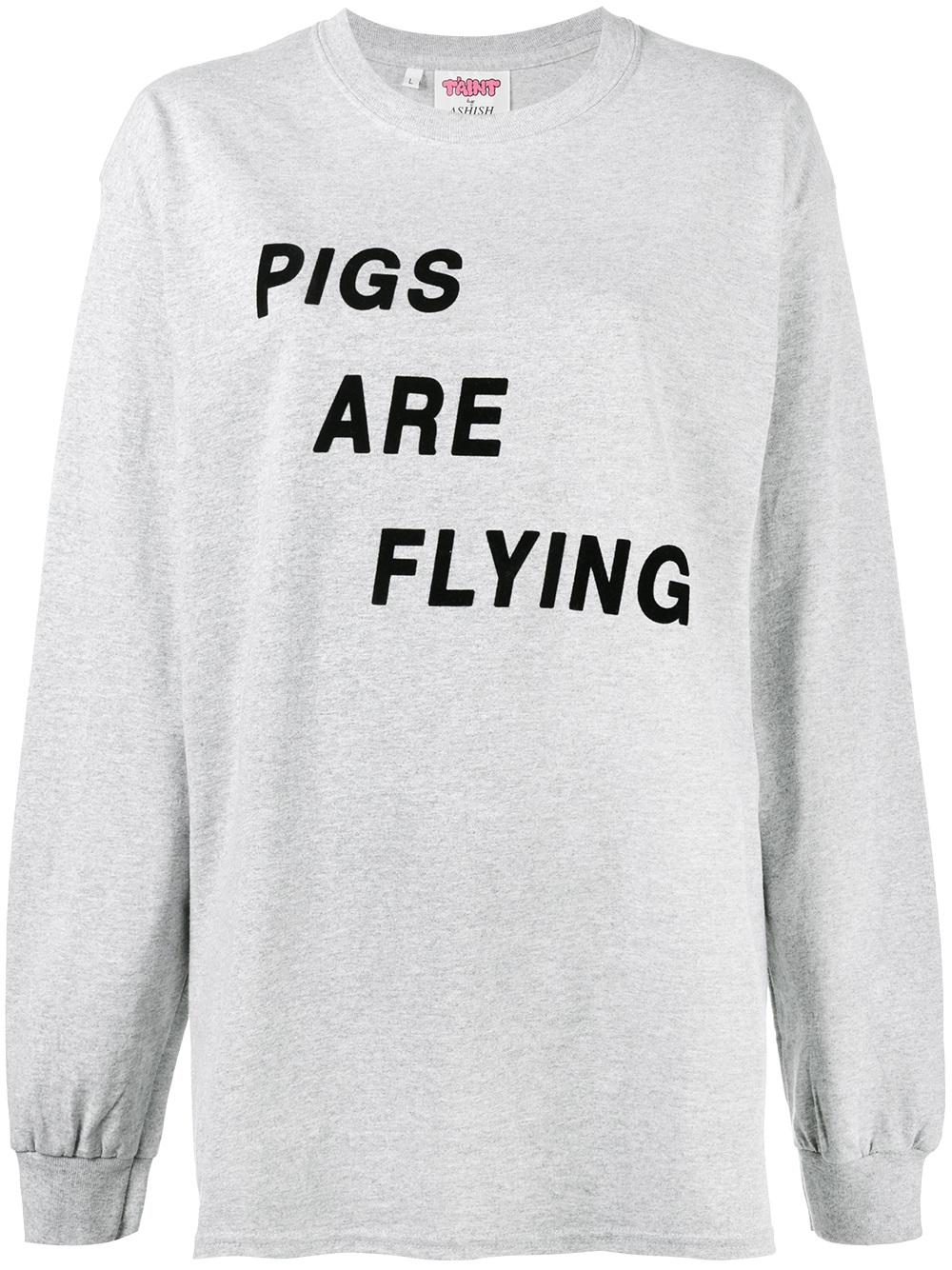 Her grey cotton t-shirt features a contrast black “Pigs Are Flying” graphic, round neck, oversized fit, long sleeves, dropped shoulders, and a straight hem.