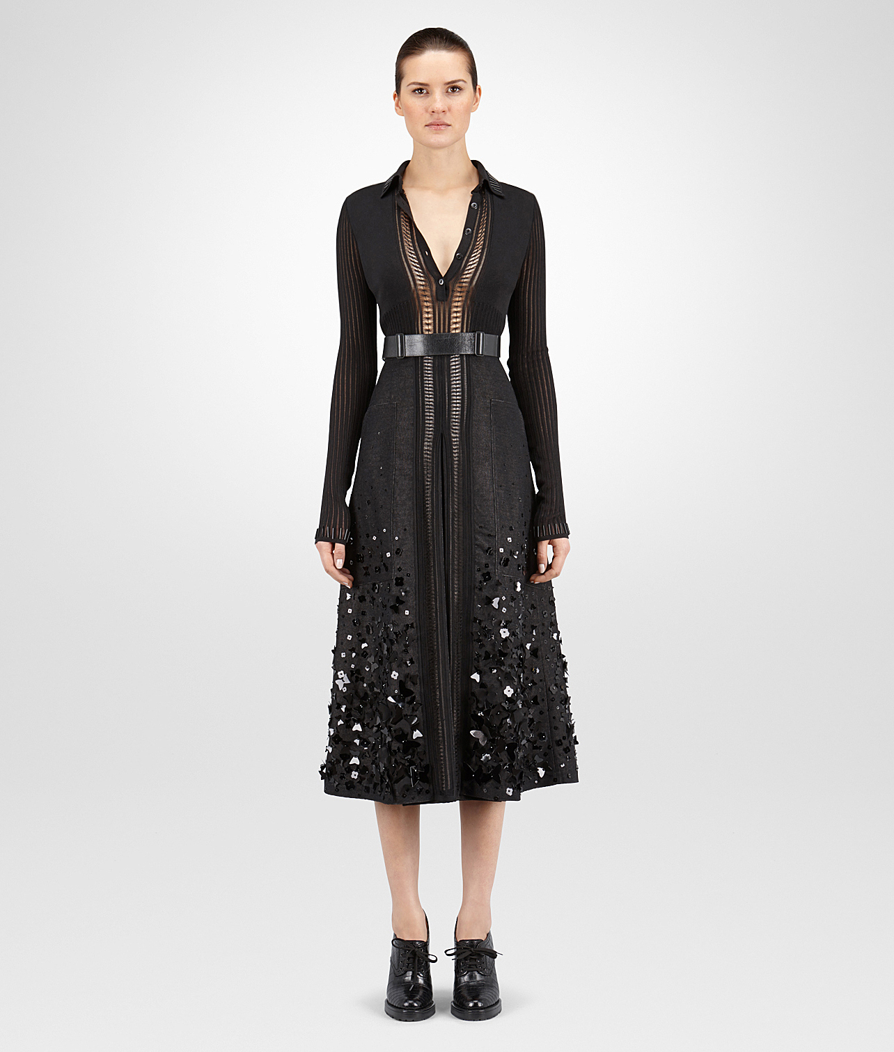 Her lightweight cotton and viscose-blend LBD features a fitted bodice, deep polo-shirt neckline, tonal beading, A-shape skirt, hand-cut butterfly shaped sequin embellishment, and a patent leather belt nipping in her waist.