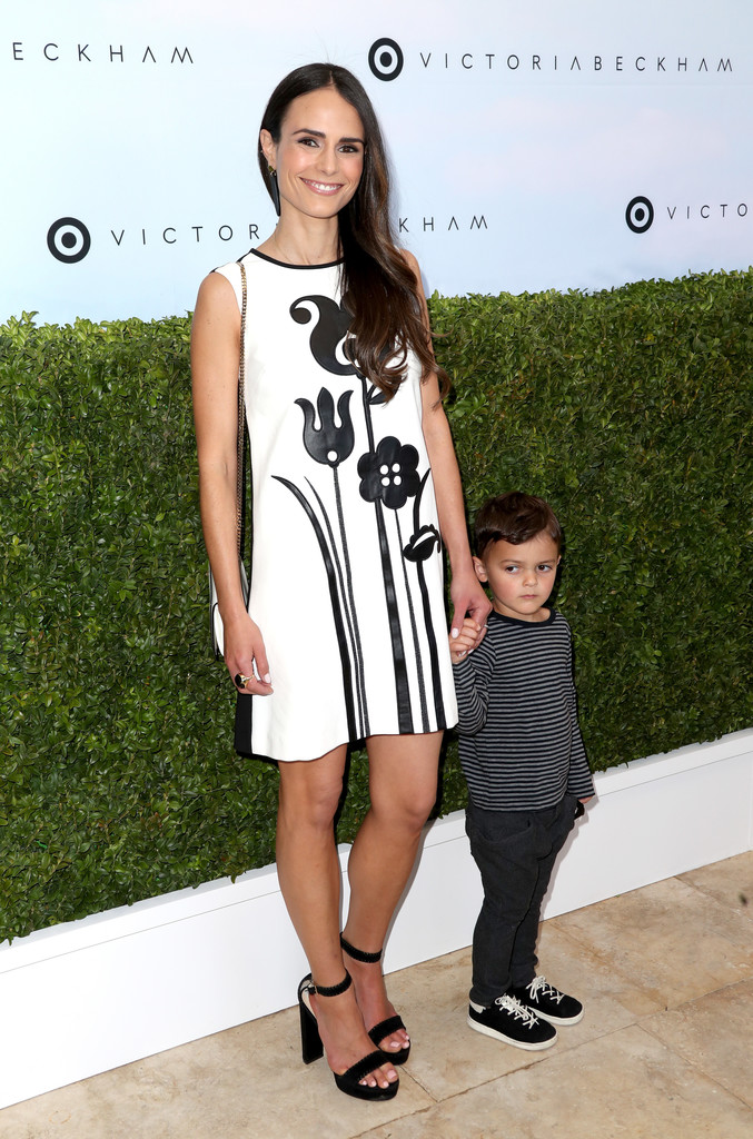Jordana Brewster opted for the classic black and white combo in a chic shift, with her adorable son in tow.