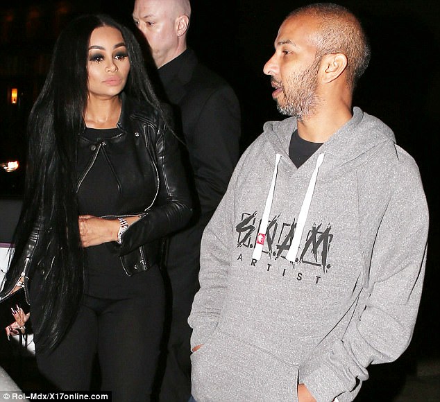 Blac Chyna headed to Tao in LA dressed in an all-black ensemble that included tights, a leather moto jacket and Versace Sculpted Platform Sandals: