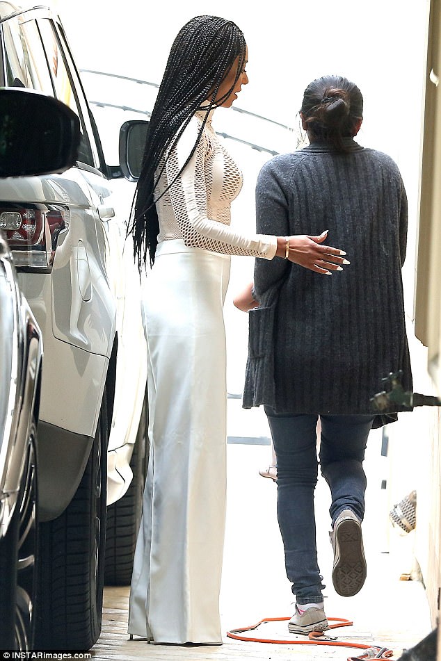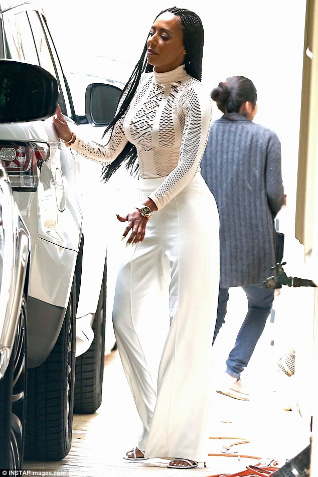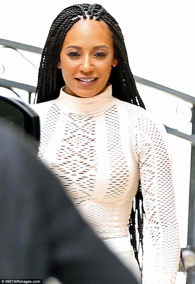 Mel B rocked waist-length braids and paired her bodysuit with white wide-leg pants and white sandals.