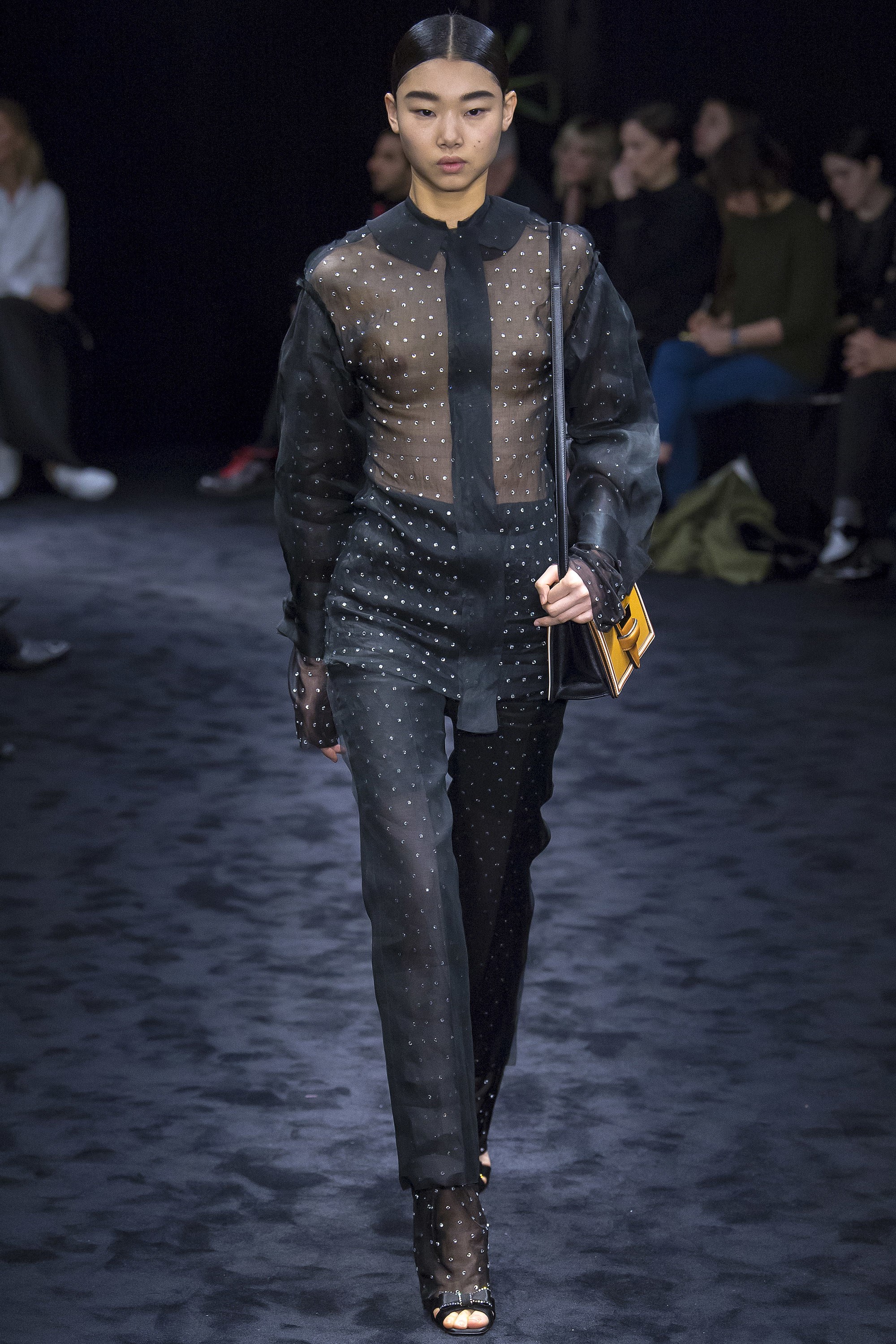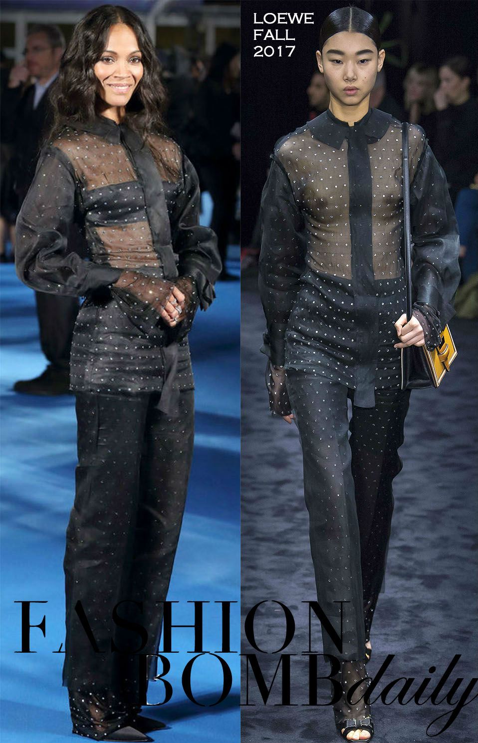 Zoe Saldana shimmered and sparkled at the Guardians of the Galaxy Vol. 2 Tokyo Premiere, where she was clad in a Loewe Fall 2017 Black Sheer Crystal Embellished Button-Front Shirt and Trousers: