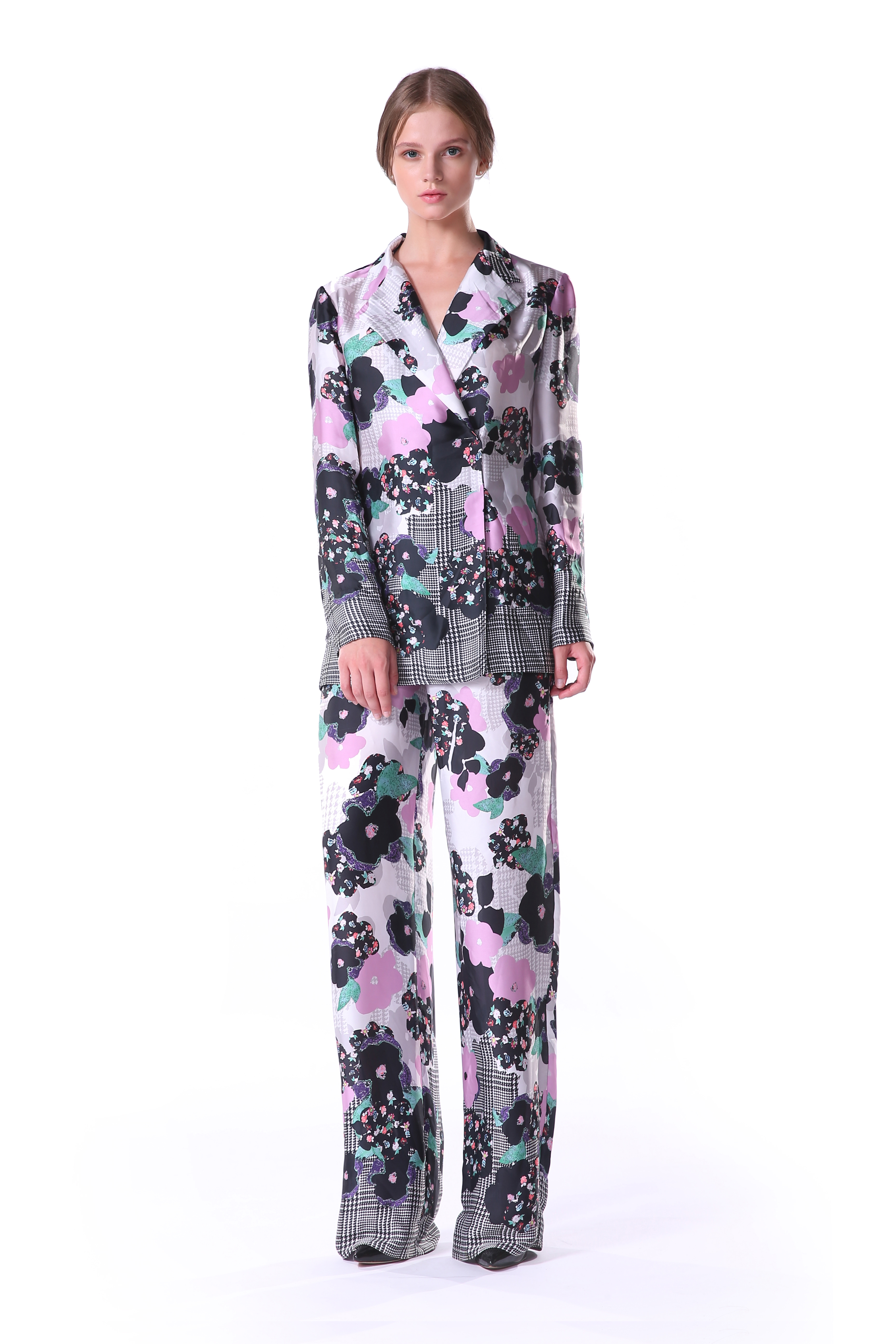 Her pajama-inspired jacket features an allover flower print and functional pockets. Her matching trousers boast a roomy silhouette and functional pockets as well.