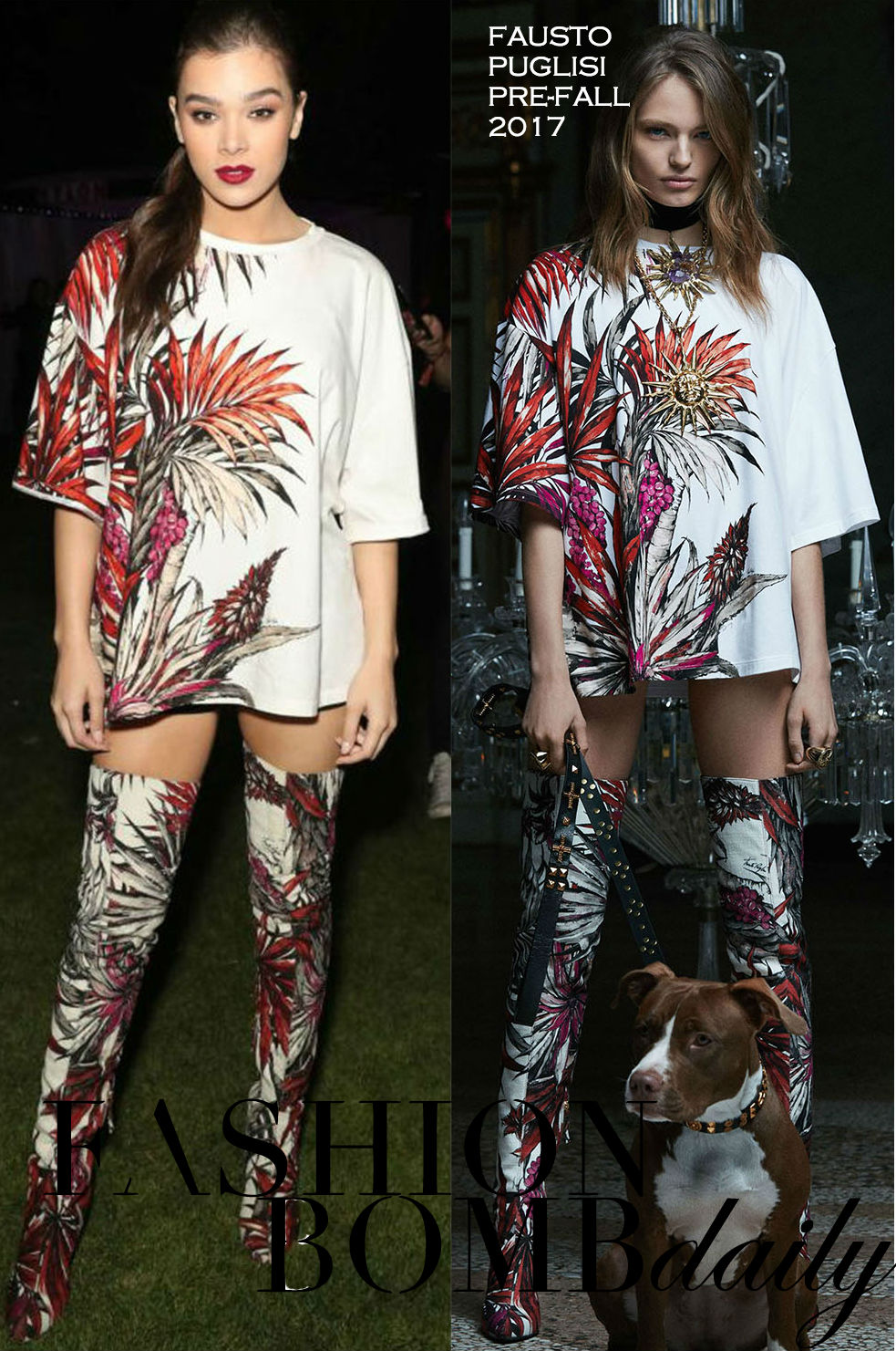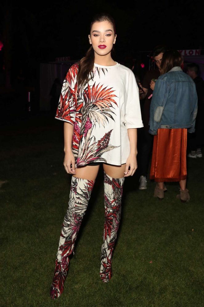 It was all about prints for Hailee Steinfeld during Coachella 2017, where she celebrated at the Nylon Magazine Midnight Garden Party in a Fausto Puglisi Pre-Fall 2017 Floral Print T-Shirt Dress and Thigh-High Boots: