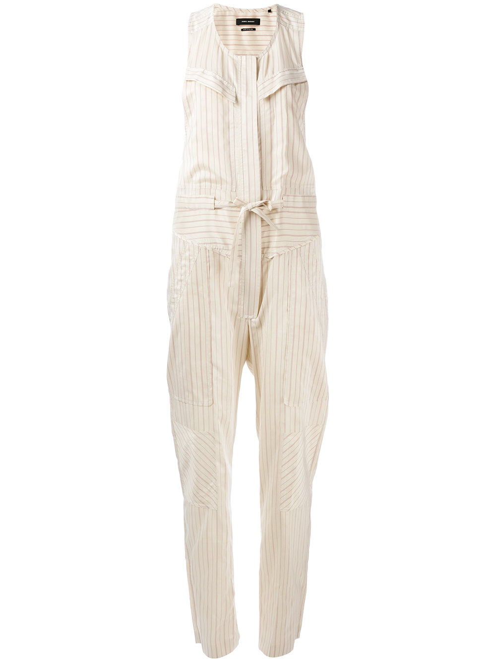 Her cream silk jumpsuit features allover stripes, a sleeveless silhouette, round neck, concealed front button placket, drawstring waist, tapered legs, and side slit pockets.