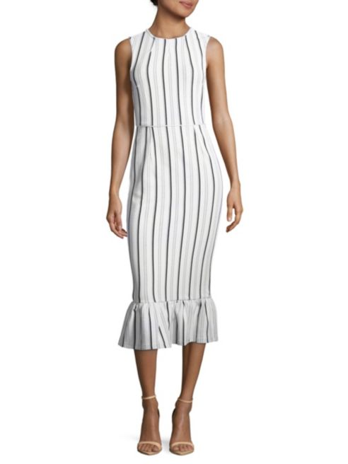 The sleeveless striped midi dress features a ruffle hem, crewneck and seamed waist.