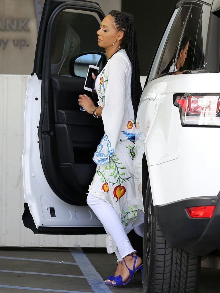 Melanie Brown was a breath of fresh Spring air in L.A., accenting an all-white ‘fit with $345 Fillyboo Strange Magic Duster and $785 Aquazzura Wild Thing Sandals:
