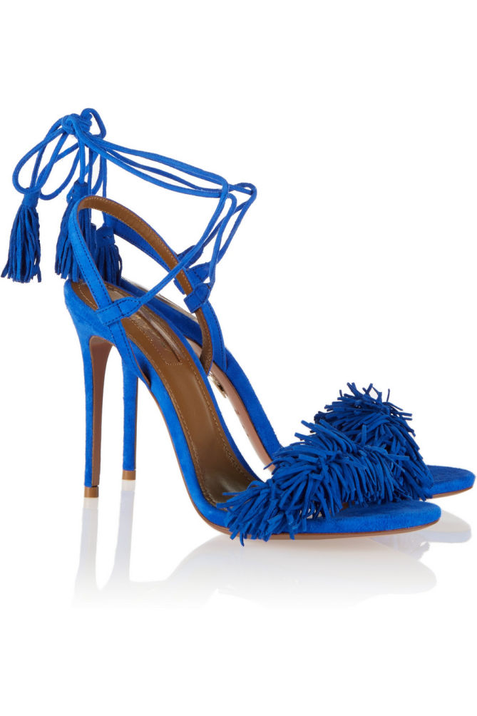 Her sandals are already a celeb fave! They feature blue fringe on the front-toe strap and self-fastening wraparound ankle straps.
