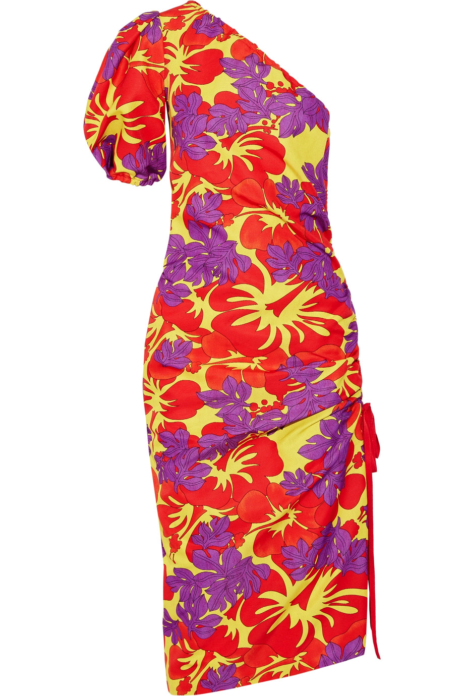 Her cotton-blend faille dress features an allover tropical floral print, midi length, one-shoulder silhouette, and ruched detailing.