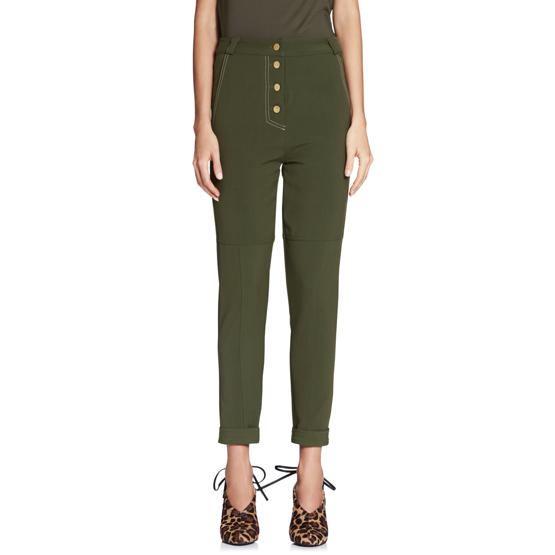 Her matching trousers boast a dropped crotch, boyfriend styling, tapered legs, slant pockets, a button-up fly, and contrasting black top stitch detailing.
