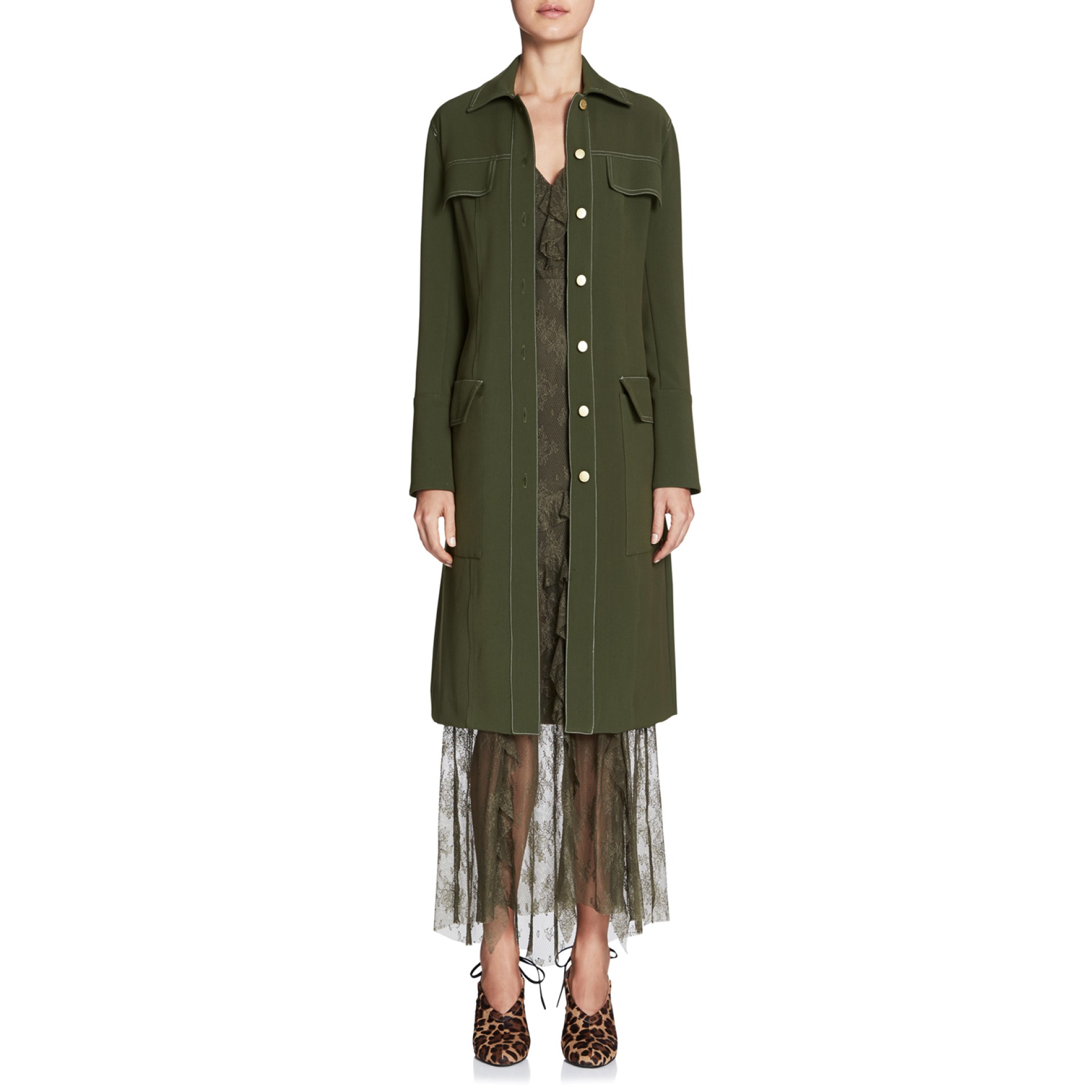 Her military-inspired trench features contrasting topstitch detailing and matte gold branded tack buttons.