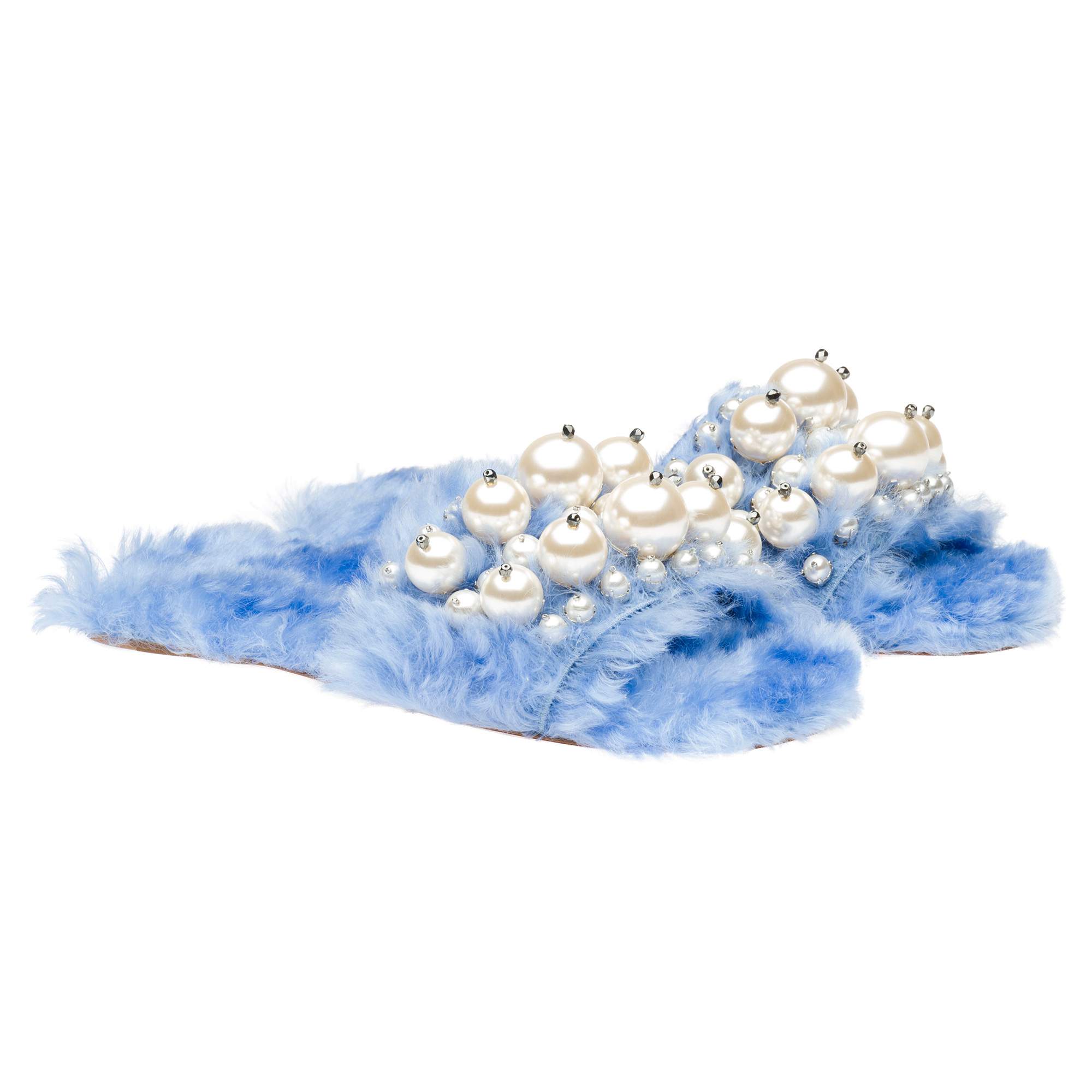 Her eco shearling slippers feature pearl embellishment and Swarovski crystal detailing.