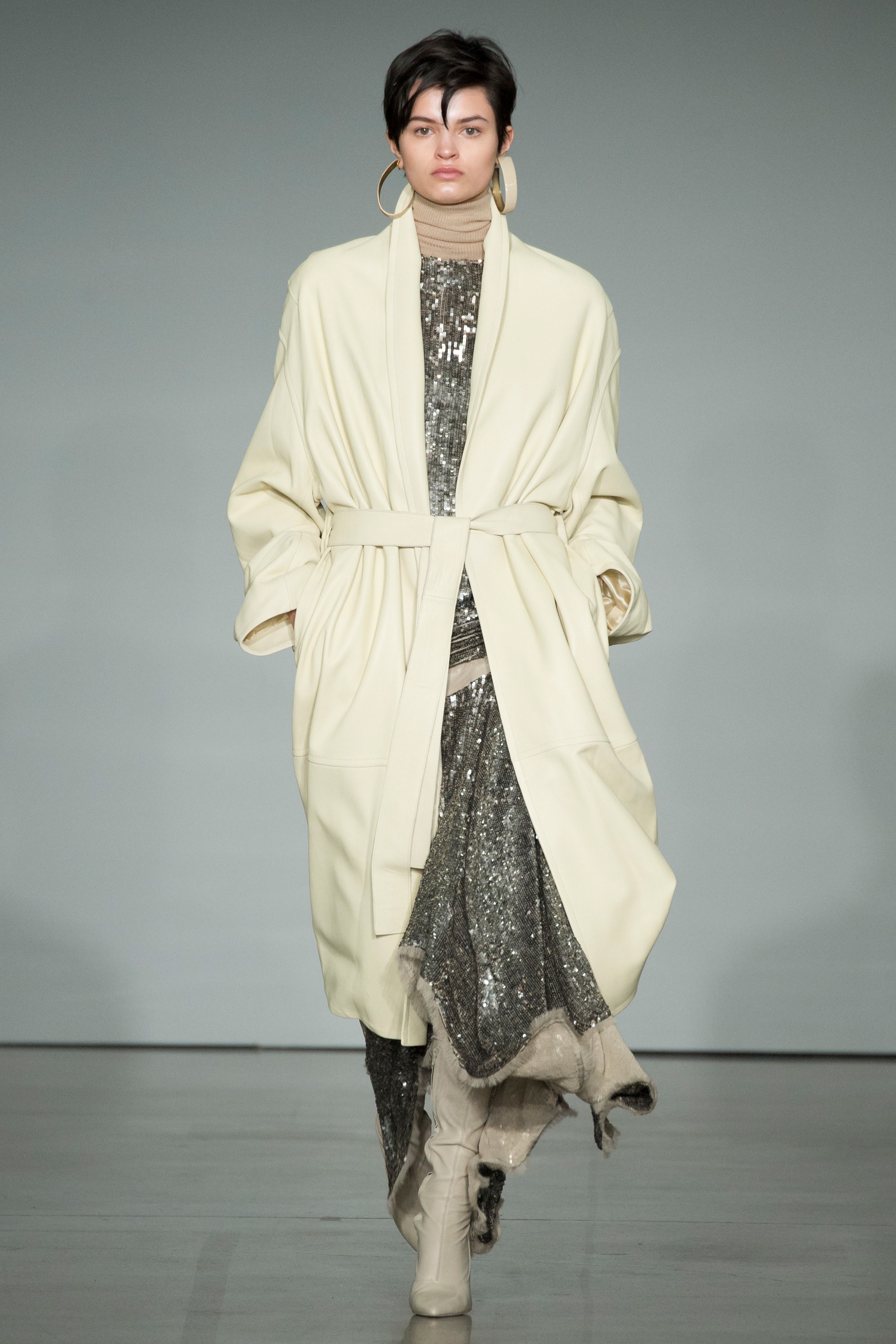 Her coat was the top layer to a sequin drop waist dress, nude turtleneck, leather boots, and hoop earrings on the Fall 2017 runway.
