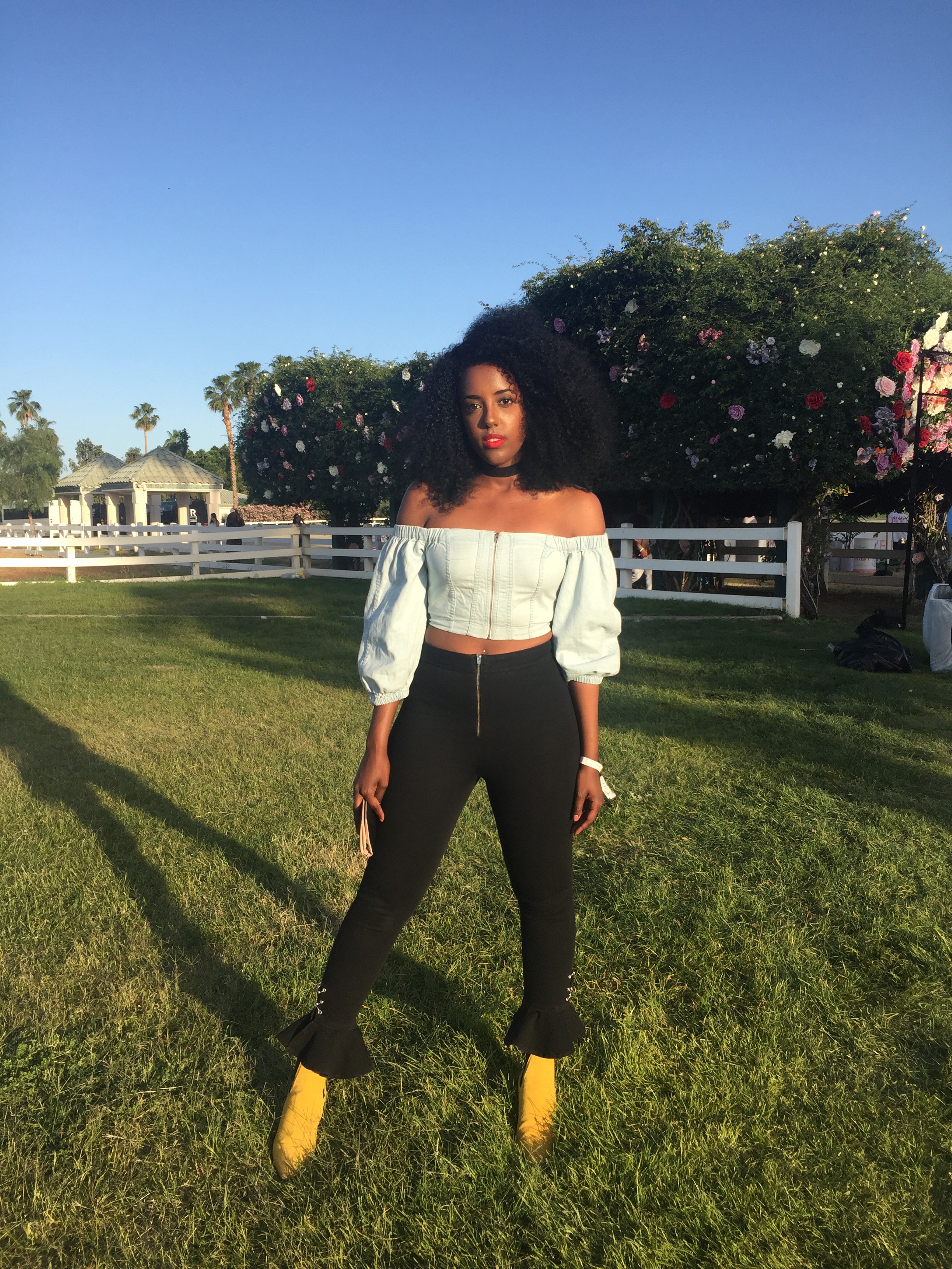 Nadra @nadrabunny was festival-ready in this off-the-shoulder crop top, black, flared ankle pants, and yellow booties. This look is a genius style move for an event like Coachella!