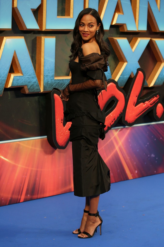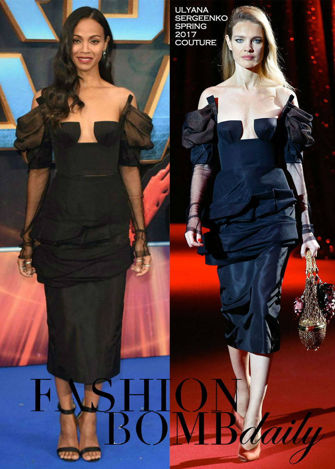 Zoe Saldana sizzled across the pond at the Guardians of the Galaxy Vol. 2 London Premiere, slipping on an Ulyana Sergeenko Spring 2017 Couture Black Off the Shoulder Dress: