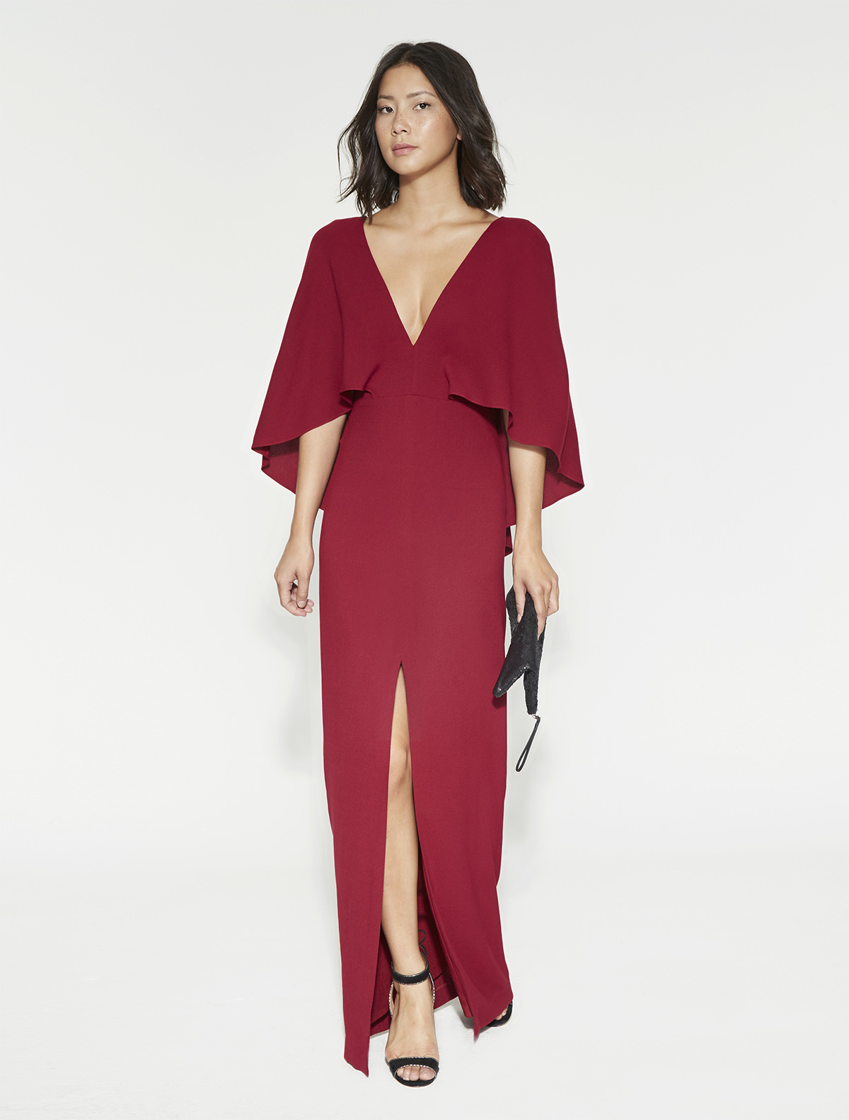Her gown features cape-inspired sleeves, a low V-neck, and a front slit at the skirt.