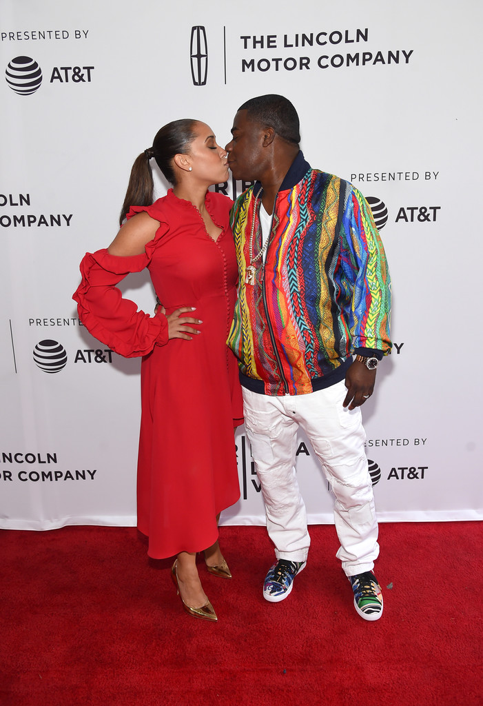 Megan Wollover was the lady in red at The Clapper 2017 Tribeca Film Festival Premiere alongside husband Tracy Morgan, clad in an $1,895 Madga Butrym Red Marbella Asymmetric Ruffled Silk Crepe Midi Dress:
