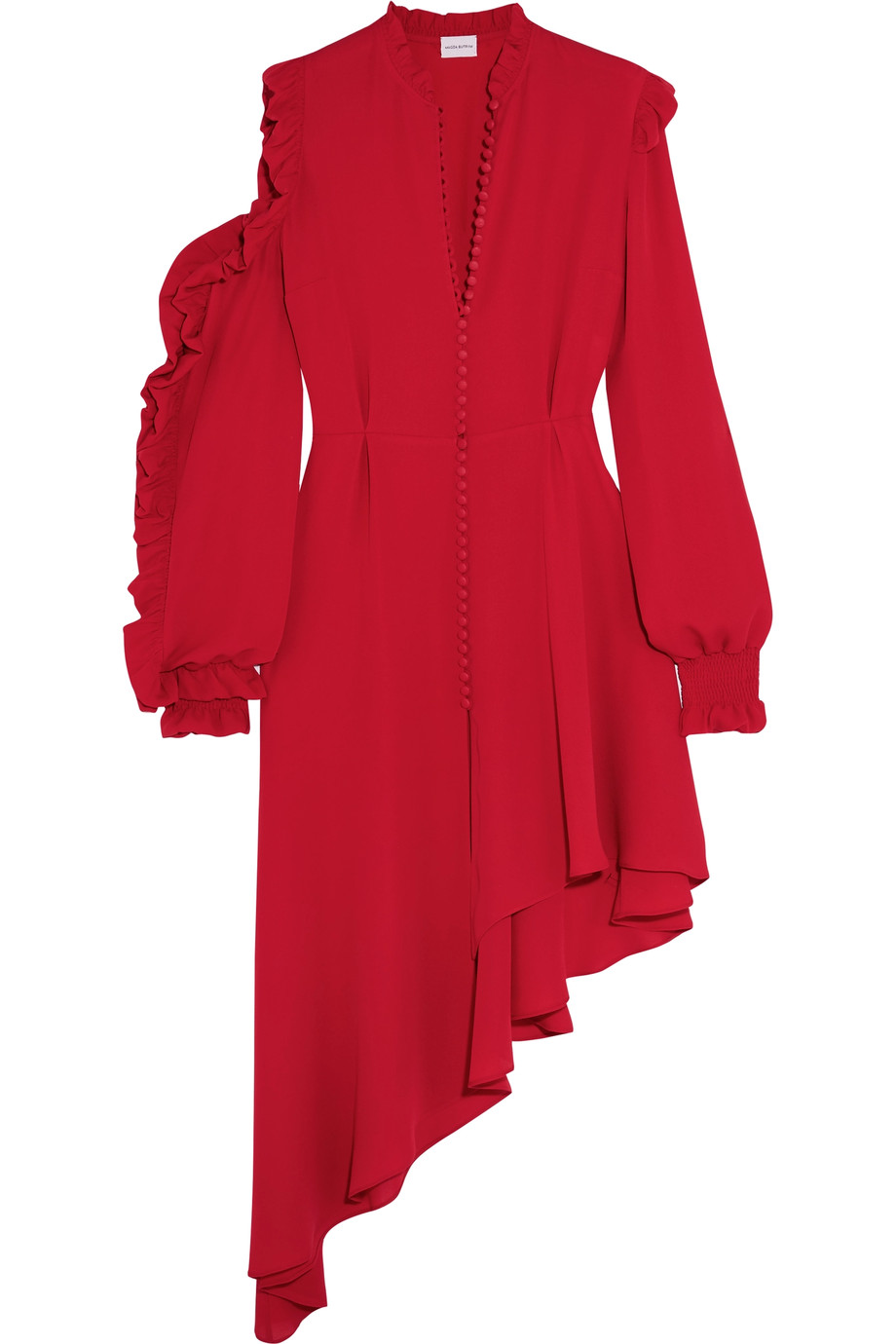 Her silk crepe dress hails from the brand’s Spring 2017 collection. It features a Victorian-inspired button front, ruffle trim, cutout shoulder detailing.