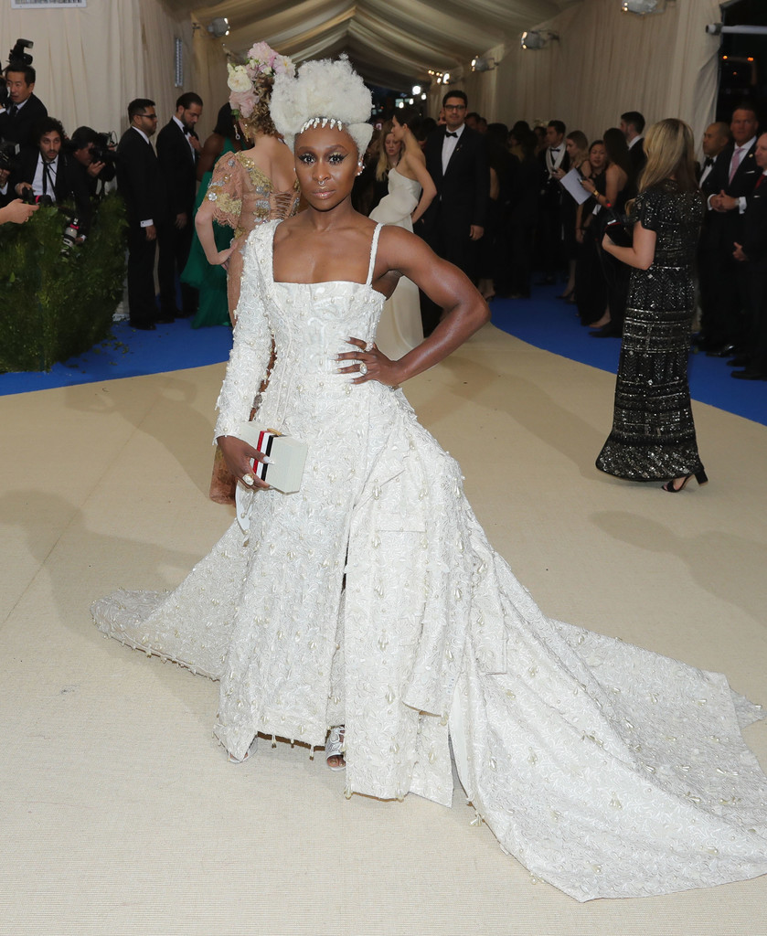 Cynthia Erivo dazzled in a white beaded Thom Browne asymmetric shoulder dress and a platinum ‘fro to match.