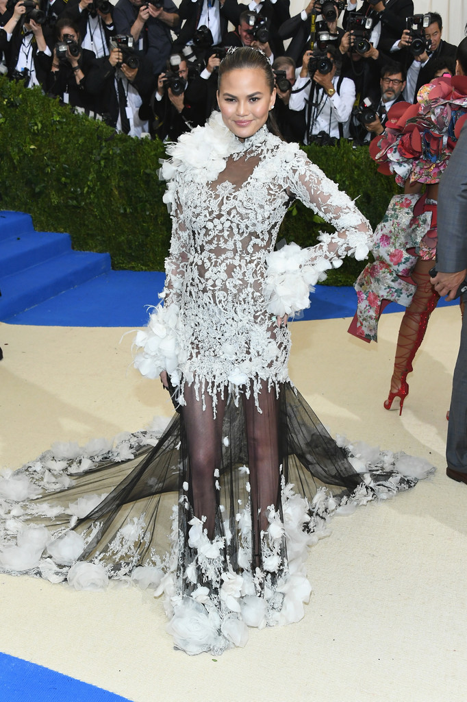 Chrissy Teigen’s feather-accented Marchesa gown was brilliant.