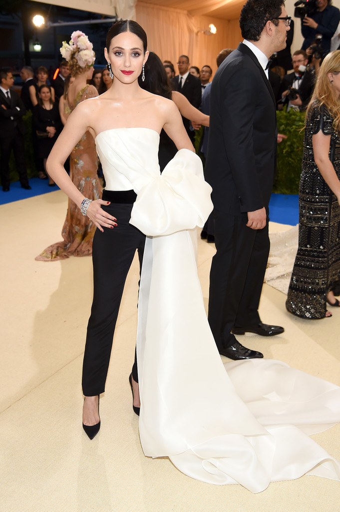 Emmy Rossum’s black and white, bow-detailed Carolina Herrera ‘fit was given a pop of color with red lips. So chic!
