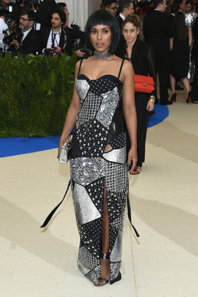 Kerry Washington slipped on a black banged bob and custom black double-crepe-sablé cutout Michael Kors gown with silver patchwork embroidery. She nailed this!