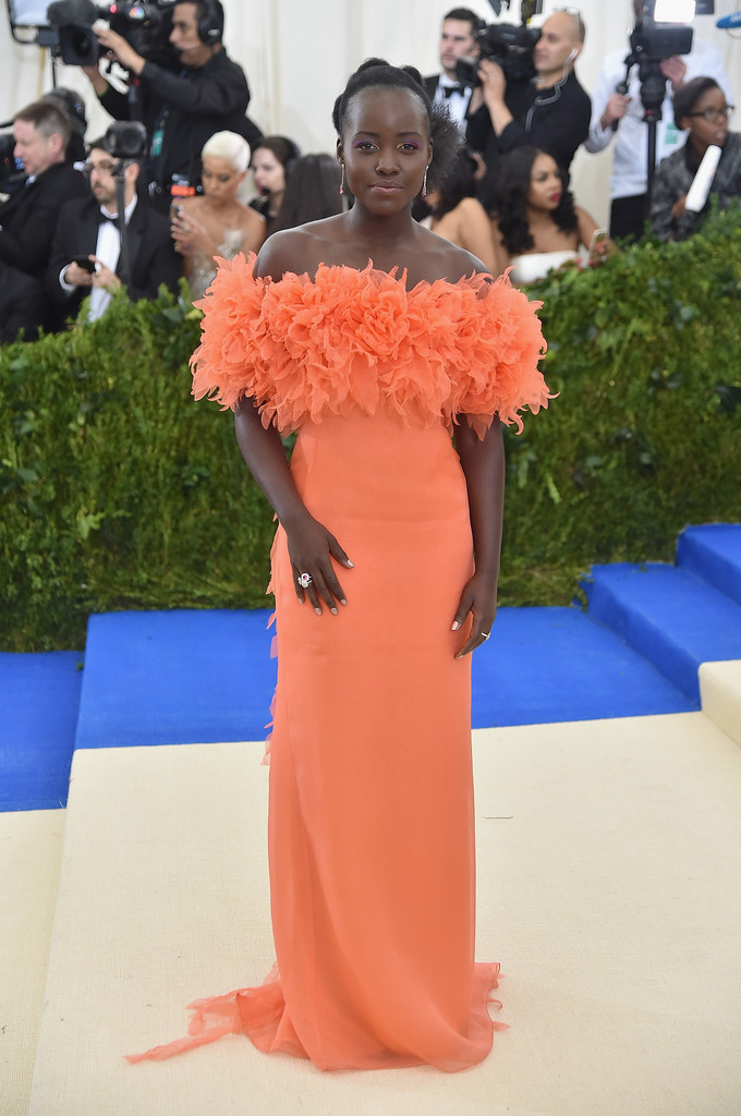 Lupita Nyong’o went bold in a coral organza chiffon Prada gown with hand-cut organza flowers at its strapless neckline. This color was so lovely on her!