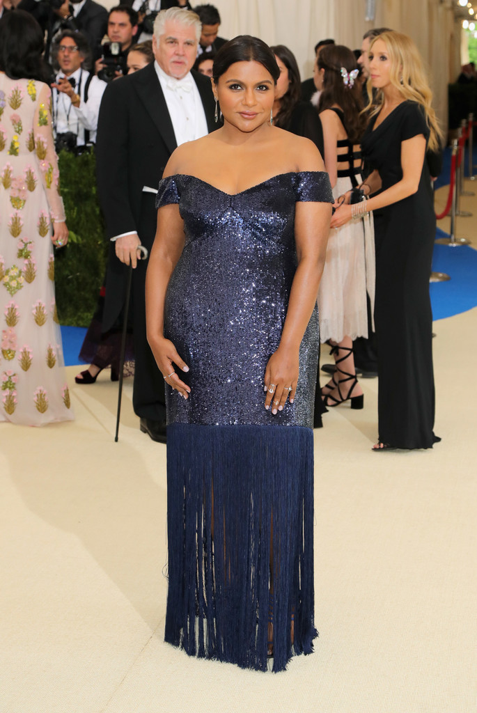 Mindy Kaling was a blue dream in a navy, off-the-shoulder sequin Prabal Gurung gown with a fringe hem. She’s never looked more stunning!