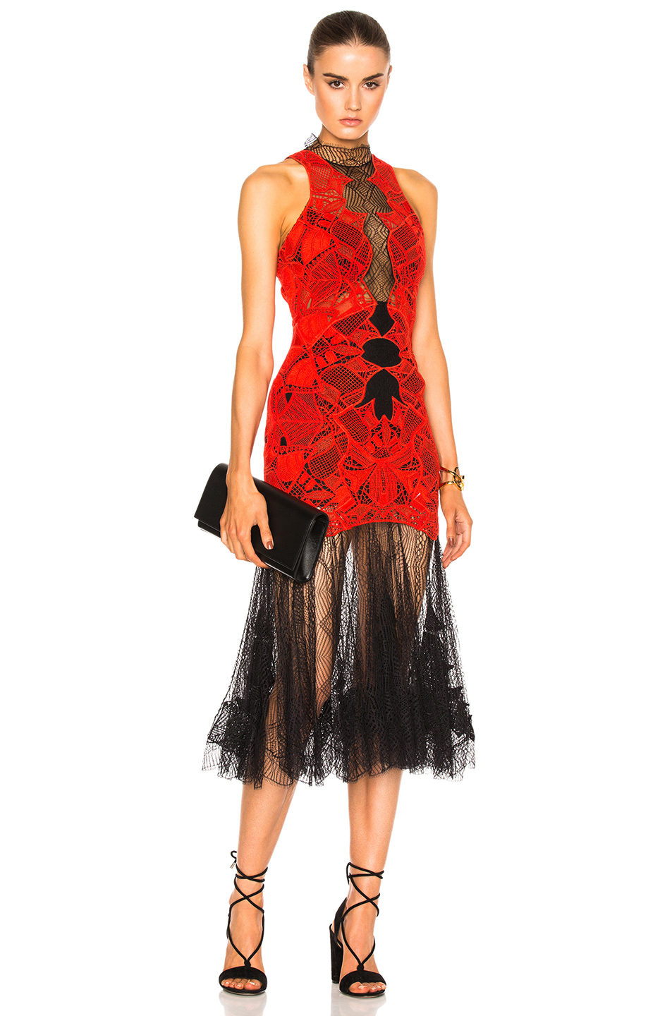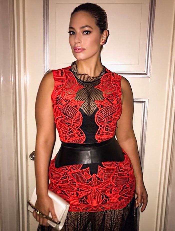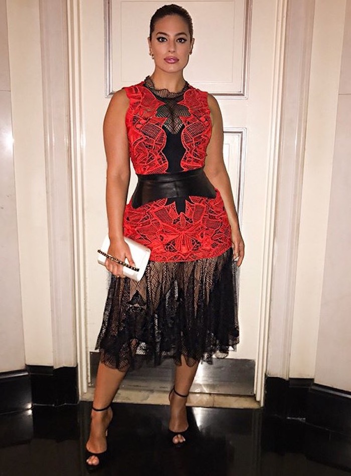 Model Ashley Graham smized for size on Instagram, clad in a $1,695 Jonathan Simkhai Red and Black Dome Lace Detail Corded Sleeveless Dress: