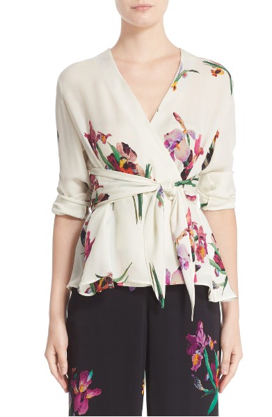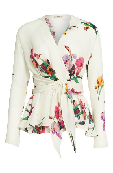 Her silk wrap blouse is enlivened with colorful birds perched atop lushly blooming Iris flowers.