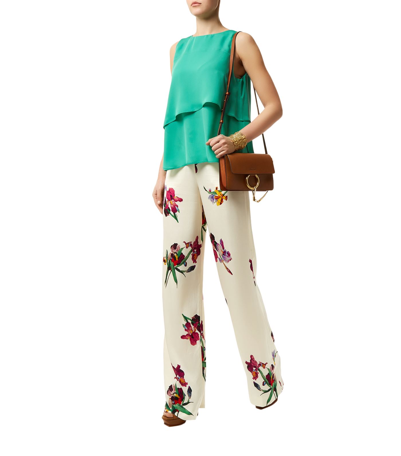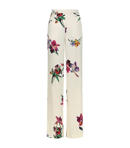 Her wide-leg palazzo pants are printed with colorful iris blooms and perched birds. A partially elasticized waist enhances the sophisticated ease of the fluid silhouette