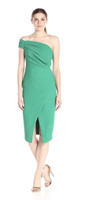The emerald green cocktail dress features an asymmetric neckline, one-shoulder silhouette with cap sleeve, pleating at the sleeve, gathered detail at the waist and a crossover skirt.
