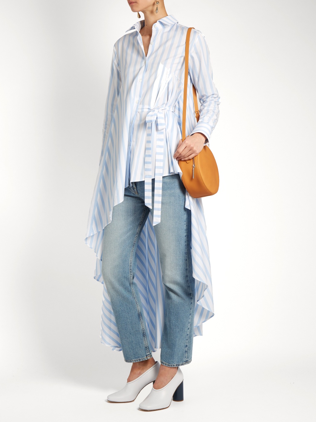 The Palmer//Harding crafts this light-blue and white striped cotton-poplin shirt with an asymmetric front and extended waterfall hem. It’s tailored for a slim fit with a point collar and side waist tie, and cascades all the way to the ankles.