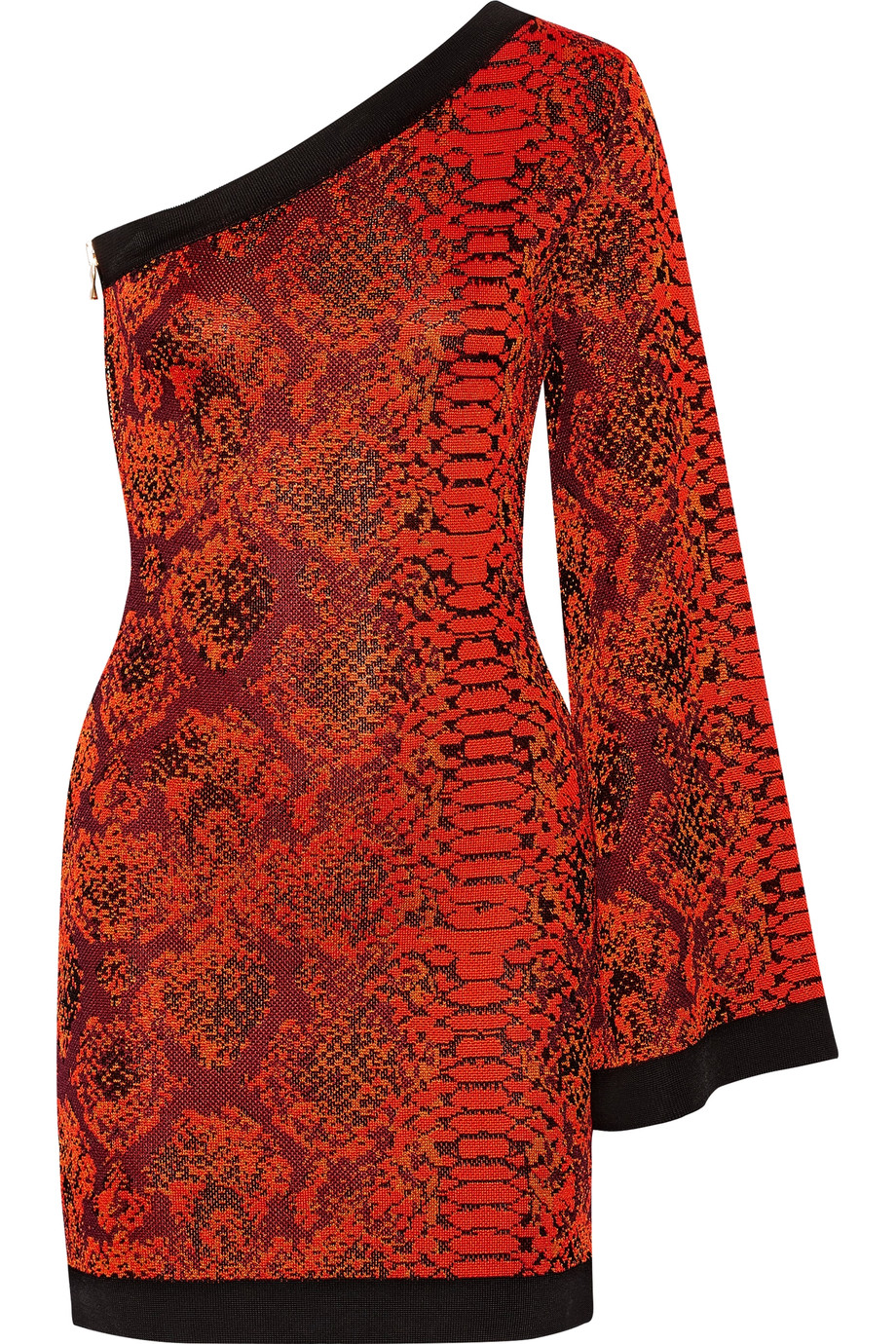 Her snake-effect jacquard knit dress features a one-shoulder silhouette, contrast black trim, one wide bell sleeve, and a side zip-fastening.