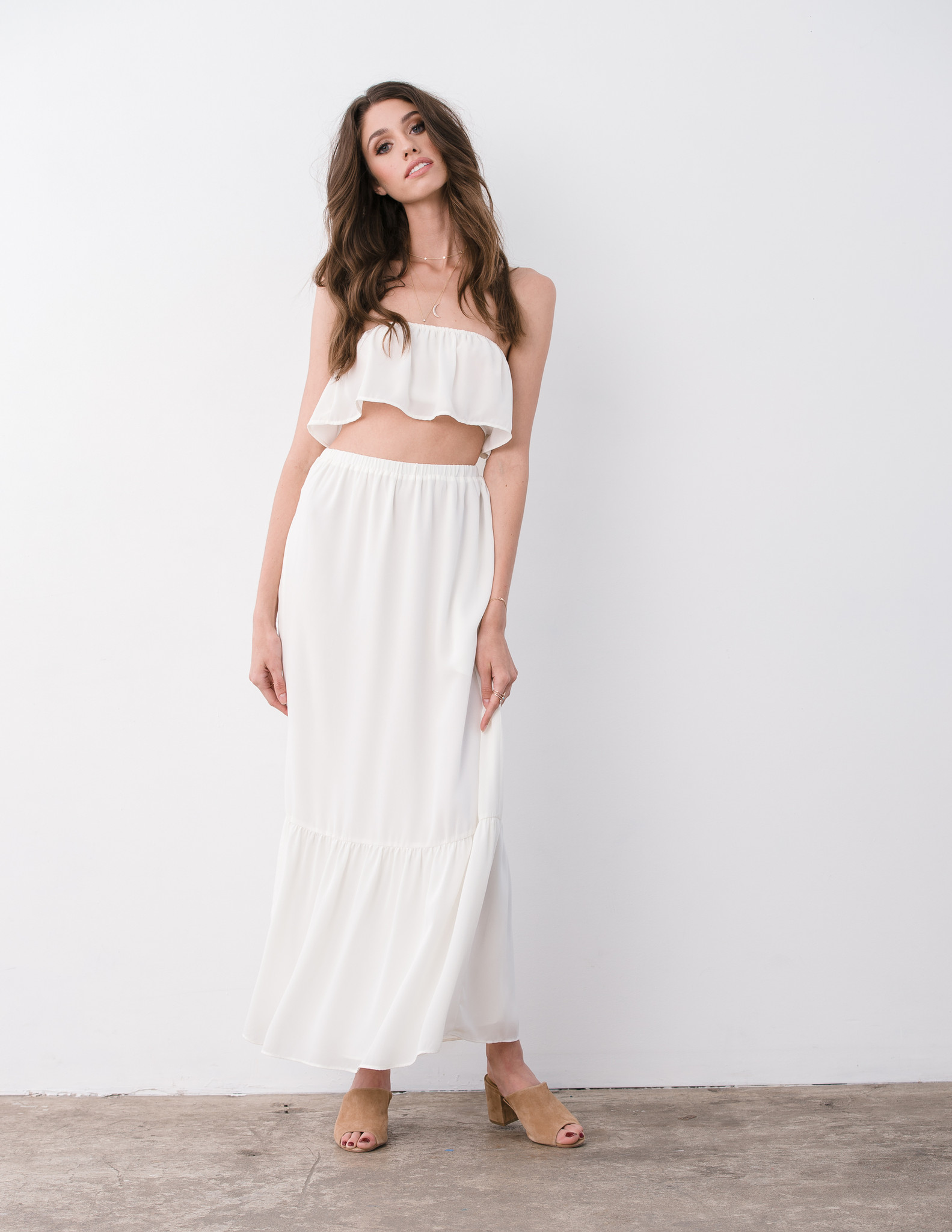 The wool dobby crepe set features an elastic ruffled crop top and an elastic waist tiered skirt with pockets.
