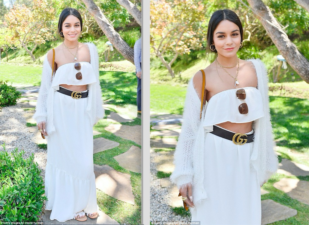 Vanessa tied her look together with a black and gold Gucci logo belt and a white knit sweater. I love her boho-chic look!