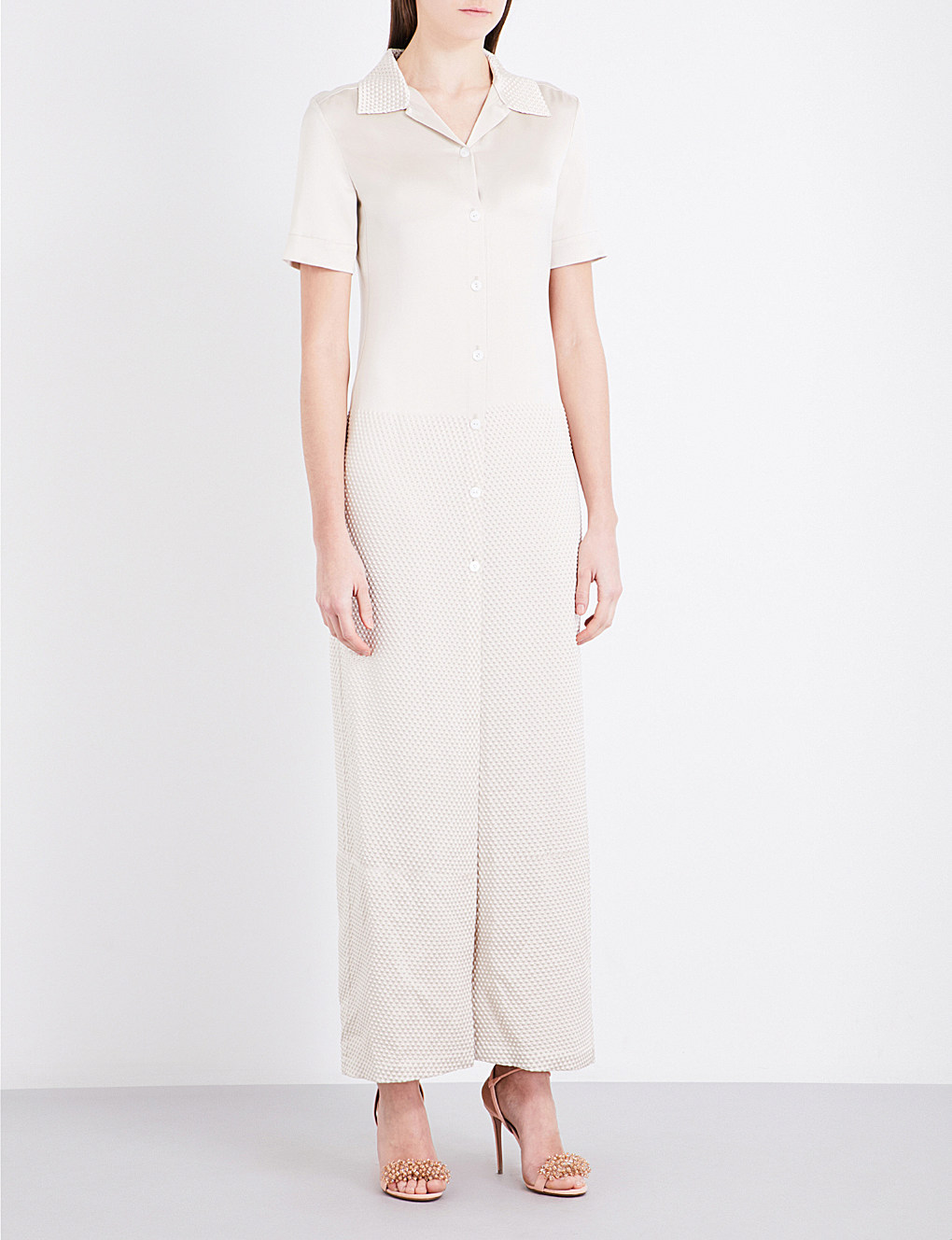 Her silk-satin dress features exposed button fastenings at the front, a polo collar, textured collar and skirt, short sleeves, a loose fit, and a front skirt split. Bella wore hers as a duster.